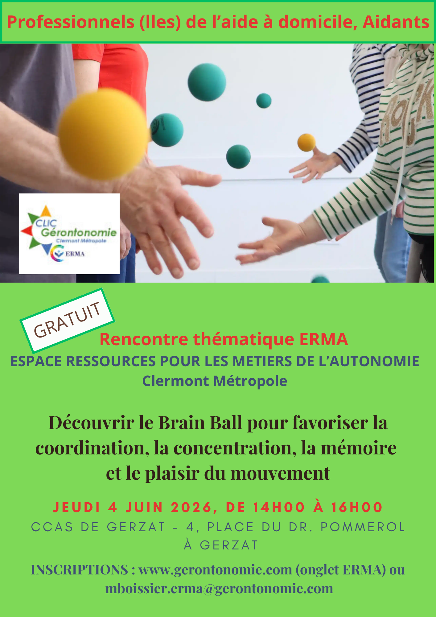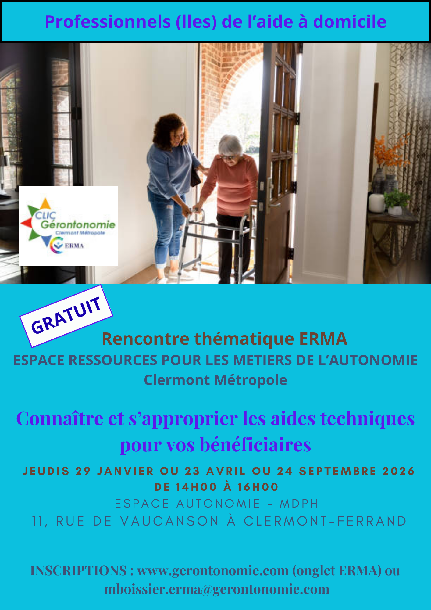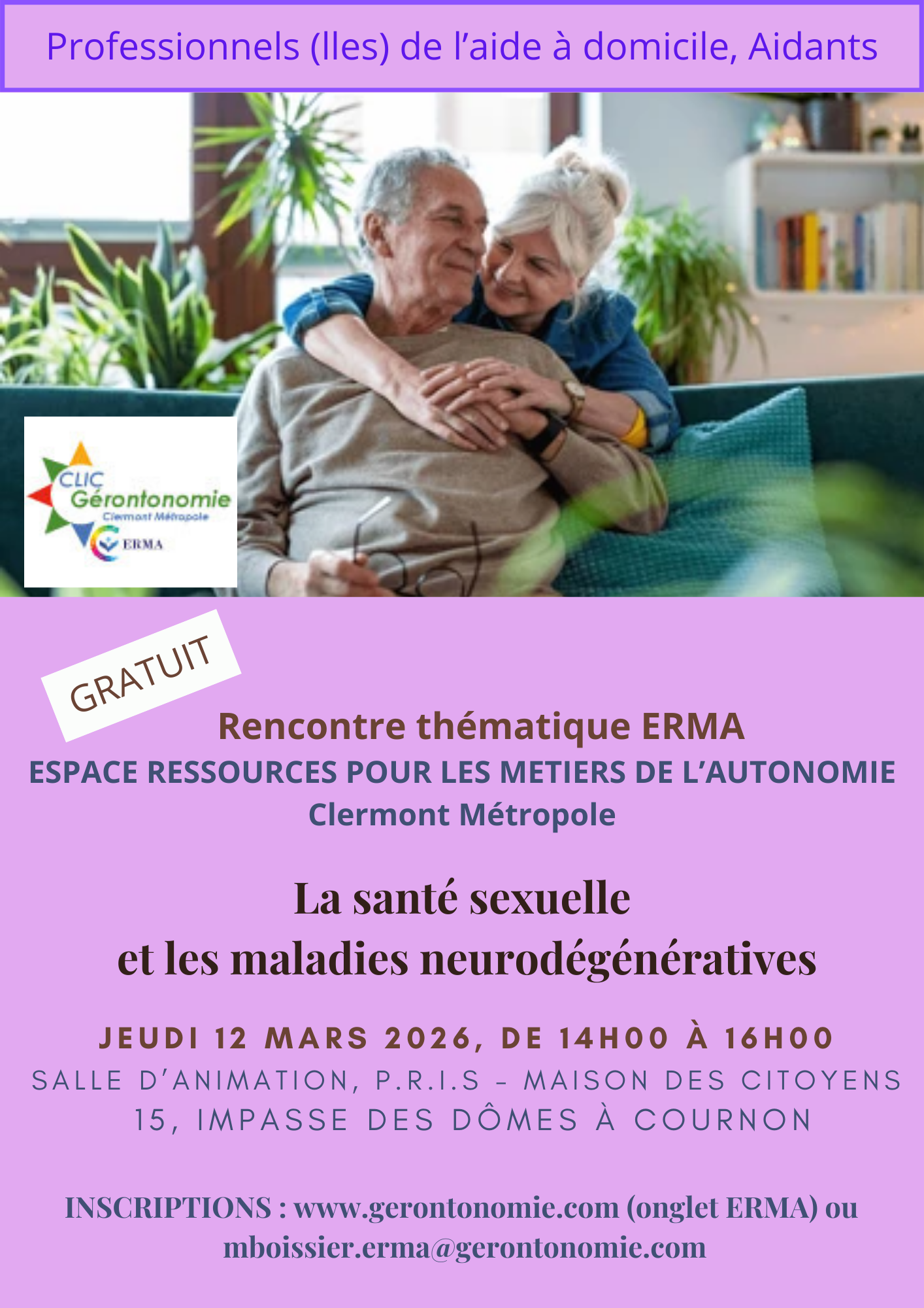 GRATUIT - Public concerné : Tout public adulte dont les aidants, aidés, auxiliaires de vie, aide-soignant(e)s, structures d'aide à domicile, Etablissement pour personnes âgées, relais de répit, CCAS, professionnels du vieillissement, mutuelles, etc.